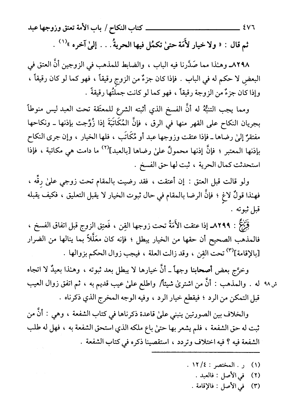 8299 - إذا عتقت الأَمَةُ تحت زوجها القِن، فَعتِق الزوج قبل اتفاق الفسخ، فالمذهب الصحيح أن حقها من الخيار يبطل؛ فإنه كان معَلَّلاً بما ينالها من الضرار [بالإقامة] (3) تحت القِن، وقد زالت العلة، فيجب زوال الحكم بزوالها.