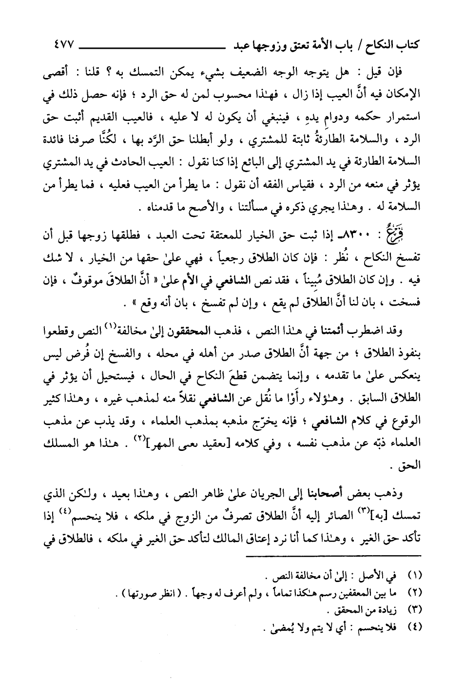 وقد اضطرب أئمتنا في هذا النص، فذهب المحققون إلى مخالفة (1) النص وقطعوا بنفوذ الطلاق؛ من جهة أنَّ الطلاق صدر من أهله في محله، والفسخ إن فُرض ليس ينعكس على ما تقدمه، وإنما يتضمن قطعَ النكاح في الحال، فيستحيل أن يؤثر في الطلاق السابق. وهؤلاء رأَوْا ما نُقل عن الشافعي نقلاً منه لمذهب غيره، وهذا كثير الوقوع في كلام الشافعي؛ فإنه يخرّج مذهبه بمذهب العلماء، وقد يذب عن مذهب العلماء ذبّه عن مذهب نفسه، وفي كلامه [ـعقيد ـعـ ـنى المهر] (2). هذا هو المسلك الحق.