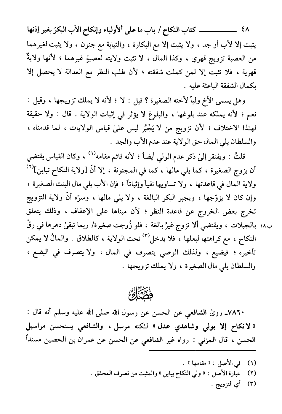 7860 - روى الشافعي عن الحسن عن رسول الله صلى الله عليه وسلم أنه قال: "لانكاح إلا بولي وشاهدي عدل" لكنه مرسل، والشافعي يستحسن مراسيل الحسن، قال المزني: رواه غير الشافعي عن الحسن عن عمران بن الحصين مسنداً