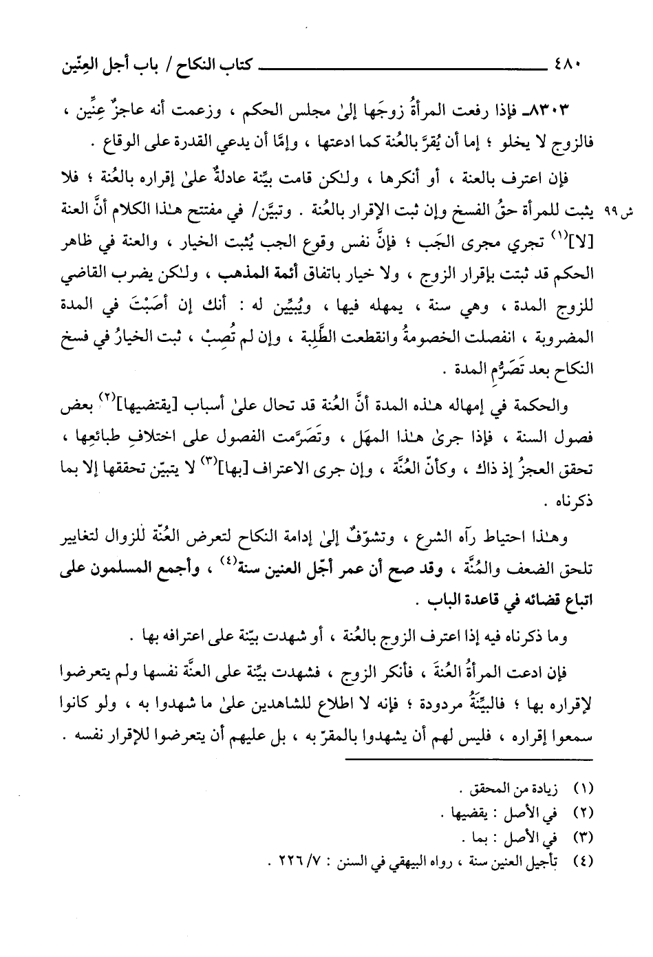 (4) تأجيل العنين سنة، رواه البيهقي في السنن: 7/ 226.