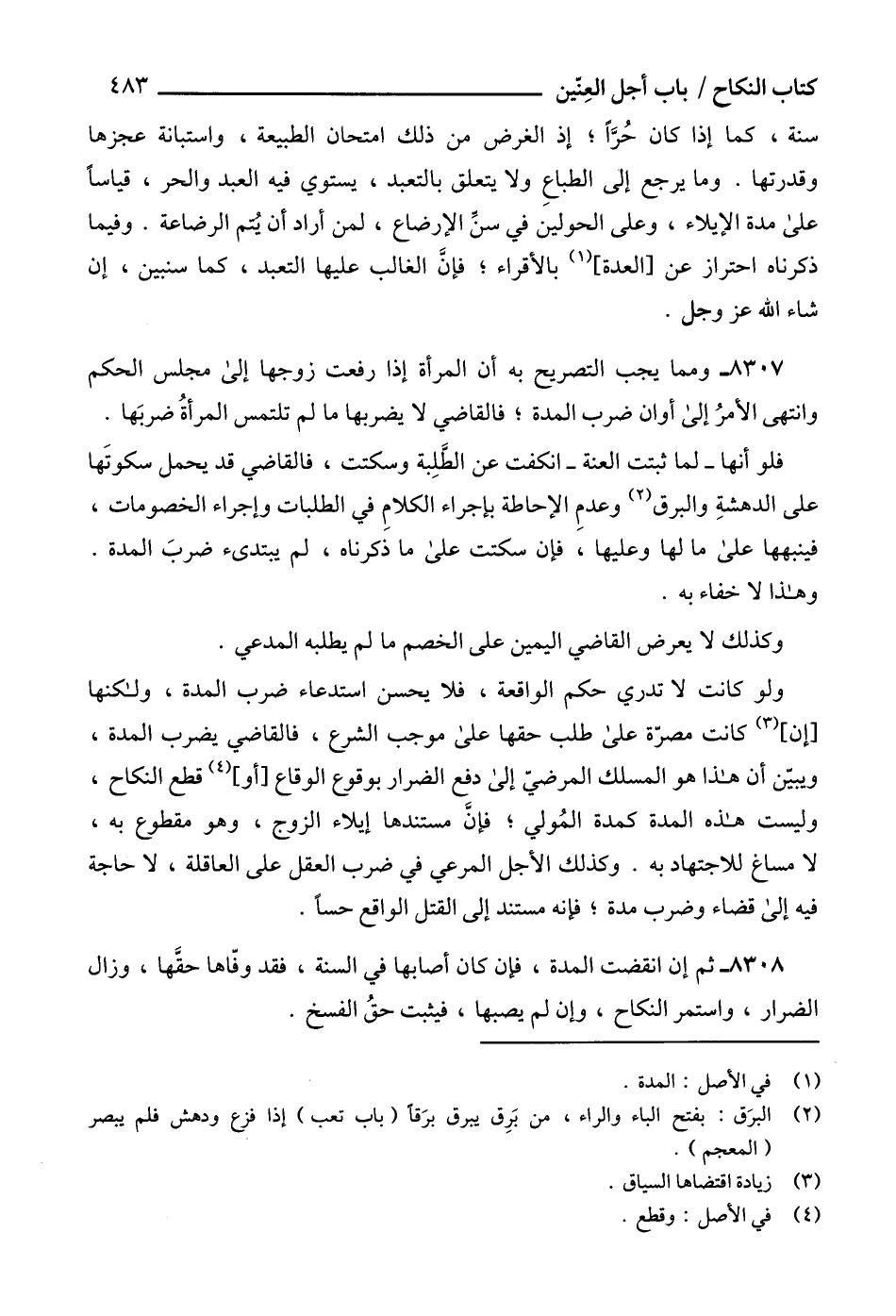 8307 - ومما يجب التصريح به أن المرأة إذا رفعت زوجها إلى مجلس الحكم وانتهى الأمرُ إلى أوان ضرب المدة؛ فالقاضي لا يضربها ما لم تلتمس المرأةُ ضربَها.