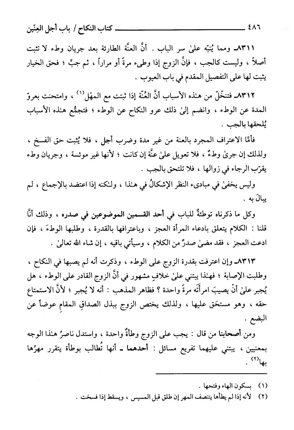 8311 - ومما يُنبّه على سر الباب. أنَّ العنَّة الطارئة بعد جريان وطء لا تثبت أصلاً، وليست كالجب، فإنَّ الزوج إذا وطىء مرةً أو مراراً، ثم جبَّ؛ فحق الخيار يثبت لها على التفصيل المقدم في باب العيوب.