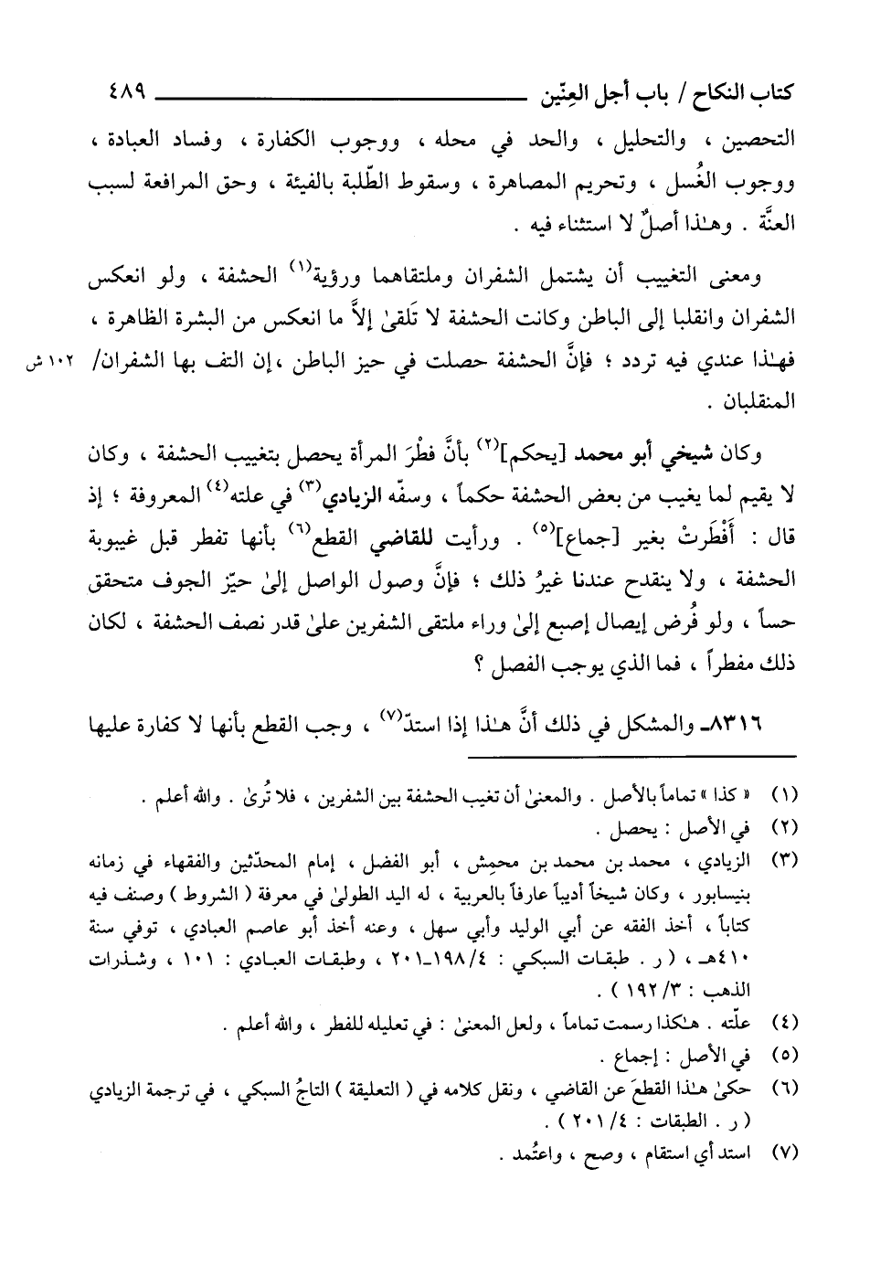 وكان شيخي أبو محمد [يحكم] (2) بأنَّ فطْرَ المرأة يحصل بتغييب الحشفة، وكان لا يقيم لما يغيب من بعض الحشفة حكماً، وسفّه الزيادي (3) في علته (4) المعروفة؛ إذ قال: أَفْطَرتْ بغير [جماع] (5). ورأيت للقاضي القطع (6) بأنها تفطر قبل غيبوبة الحشفة، ولا ينقدح عندنا غيرُ ذلك؛ فإنَّ وصول الواصل إلى حيّز الجوف متحقق حساً، ولو فُرض إيصال إصبع إلى وراء ملتقى الشفرين على قدر نصف الحشفة، لكان ذلك مفطراً، فما الذي يوجب الفصل؟