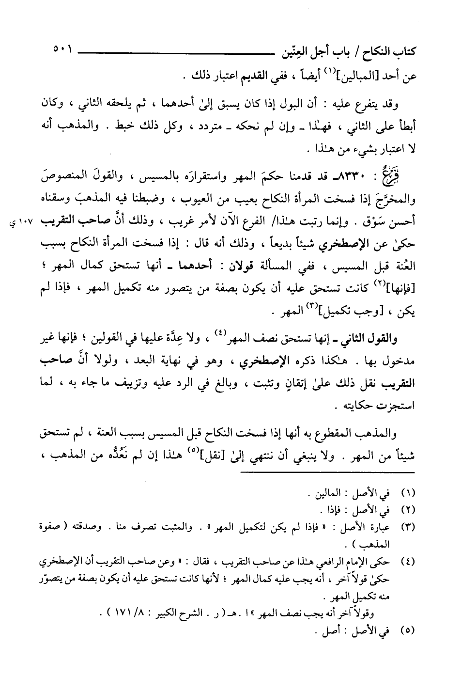8330 - قد قدمنا حكمَ المهر واستقرارَه بالمسيس، والقولَ المنصوصَ والمخرَّجَ إذا فسخت المرأة النكاح بعيب من العيوب، وضبطنا فيه المذهبَ وسقناه أحسن سَوْق. وإنما رتبت هذا الفرع الآن لأمر غريب، وذلك أنَّ صاحب التقريب حكى عن الإصطخري شيئاًً بديعاً، وذلك أنه قال: إذا فسخت المرأة النكاح بسبب العُنة قبل المسيس، ففي المسألة قولان: أحدهما - أنها تستحق كمال المهر؛ [فإنها] (2) كانت تستحق عليه أن يكون بصفة من يتصور منه تكميل المهر، فإذا لم يكن، [وجب تكميل] (3) المهر.