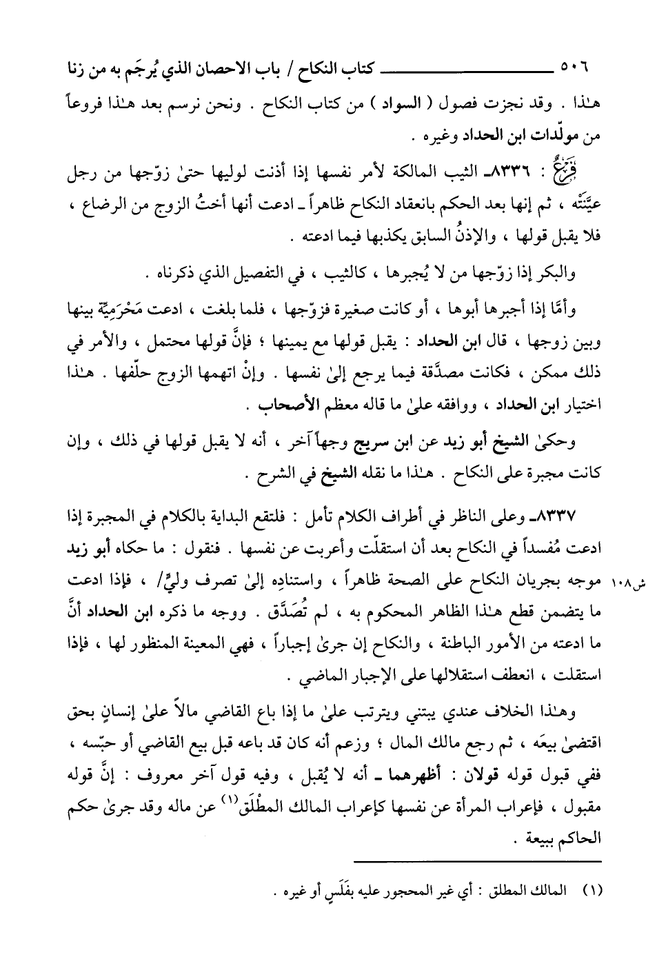 8337 - وعلى الناظر في أطراف الكلام تأمل: فلتقع البداية بالكلام في المجبرة إذا ادعت مُفسداً في النكاح بعد أن استقلّت وأعربت عن نفسها. فنقول: ما حكاه أبو زيد موجه بجريان النكاح على الصحة ظاهراً، واستنادِه إلى تصرف وليٍّ، فإذا ادعت ما يتضمن قطع هذا الظاهر المحكوم به، لم تُصَدَّق. ووجه ما ذكره ابن الحداد أنَّ ما ادعته من الأمور الباطنة، والنكاح إن جرى إجباراً، فهي المعينة المنظور لها، فإذا استقلت، انعطف استقلالها على الإجبار الماضي.