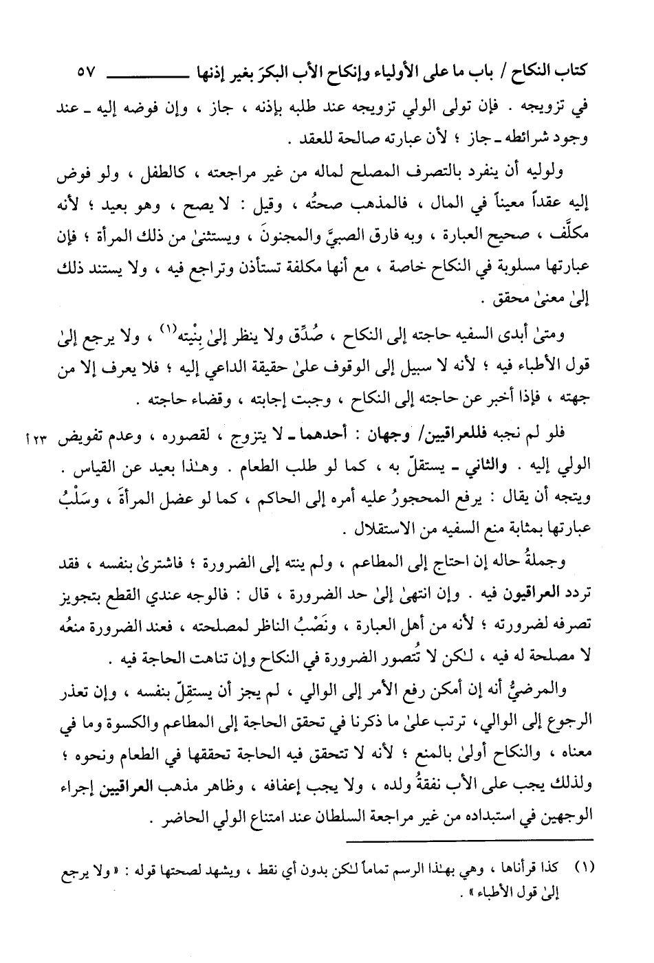 والمرضيُّ أنه إن أمكن رفع الأمر إلى الوالي، لم يجز أن يستقِلّ بنفسه، وإن تعذر الرجوع إلى الوالي، ترتب على ما ذكرنا في تحقق الحاجة إلى المطاعم والكسوة وما في معناه، والنكاح أولى بالمنع؛ لأنه لا تتحقق فيه الحاجة تحققها في الطعام ونحوه؛ ولذلك يجب على الأب نفقةُ ولده، ولا يجب إعفافه، وظاهر مذهب العراقيين إجراء الوجهين في استبداده من غير مراجعة السلطان عند امتناع الولي الحاضر.