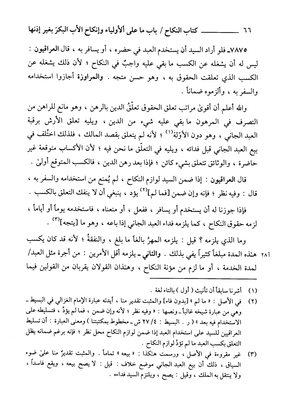 (2) في الأصل: "ما لم" [بدون فاء] والمثبت تقدير منا، أيدته عبارة الإمام الغزالي في البسيط -وهي من عبارة شيخه غالباً- ونصها: "وفيه نظر؛ لأنه وإن ضمن، فما لم يؤدِّ، فتسليطه على الاستخدام فيه بعد" (ر. البسيط: 4/ 27 ش- مخطوط بمكتبتنا) ومعنى العبارة: أن تسليط العراقيين للسيد على استخدام العبد إذا ضمن لوازم النكاح محل نظر؛ فإنه برغم ضمانه يظل التعلق بكسب العبد ما لم تؤدَّ لوازم النكاح.