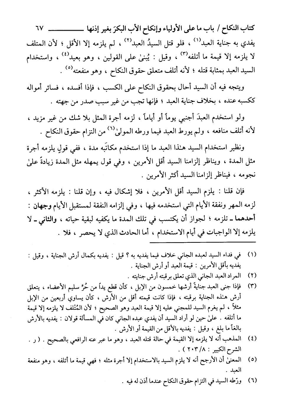 (5) المعنى أن الأرجح أنه لا يلزم السيد بالاستخدام إلا أجرة مثله؛ فهي قيمة ما أتلفه، وهو منفعة العبد.