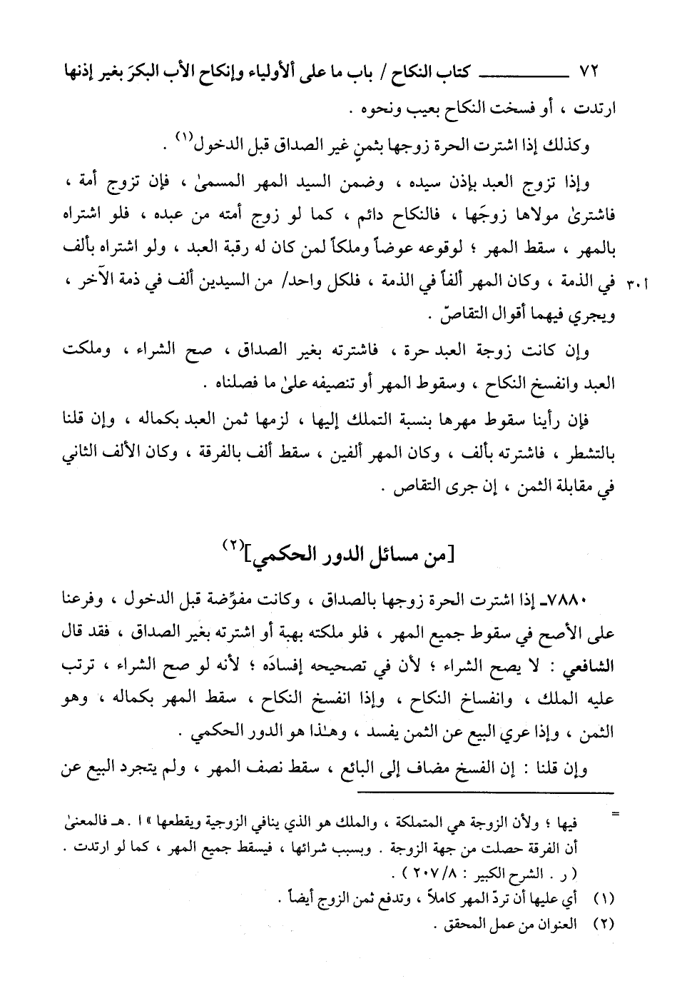 7880 - إذا اشترت الحرة زوجها بالصداق، وكانت مفوِّضة قبل الدخول، وفرعنا على الأصح في سقوط جميع المهر، فلو ملكته بهبة أو اشترته بغير الصداق، فقد قال الشافعي: لا يصح الشراء؛ لأن في تصحيحه إفسادَه؛ لأنه لو صح الشراء، ترتب عليه الملك، وانفساخ النكاح، وإذا انفسخ النكاح، سقط المهر بكماله، وهو الثمن، وإذا عري البيع عن الثمن يفسد، وهذا هو الدور الحكمي.