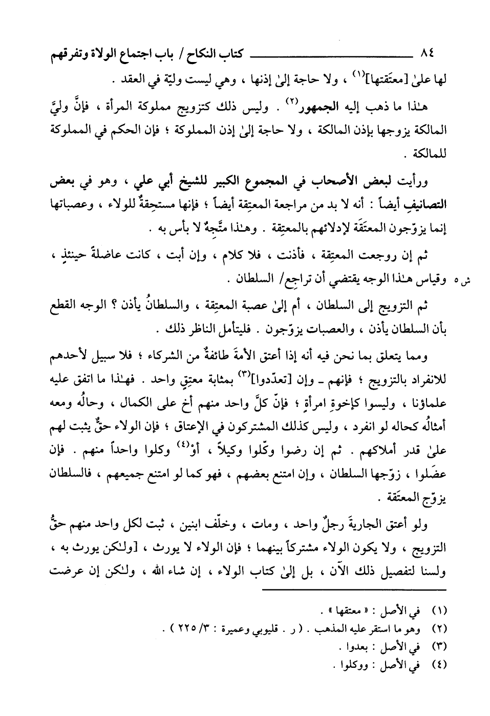 ورأيت لبعض الأصحاب في المجموع الكبير للشيخ أبي علي، وهو في بعض التصانيفِ أيضاًً: أنه لا بد من مراجعة المعتِقة أيضاًً؛ فإنها مستحِقةٌ للولاء، وعصباتها إنما يزوّجون المعتَقَة لإدلائهم بالمعتِقة. وهذا متَجِهٌ لا بأس به.