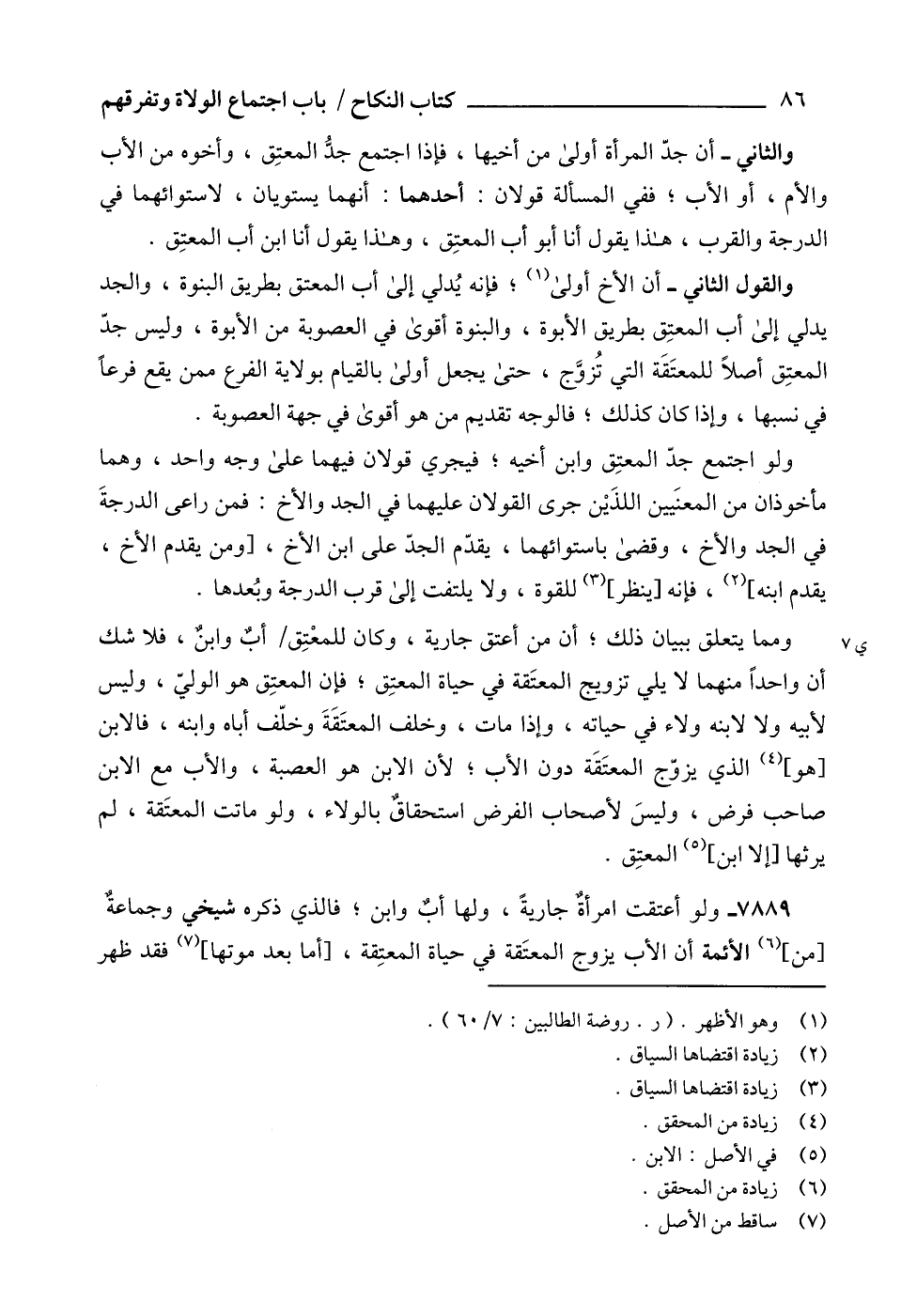 7889 - ولو أعتقت امرأةٌ جاريةً، ولها أبٌ وابن؛ فالذي ذكره شيخي وجماعةٌ [من] (6) الأئمة أن الأب يزوج المعتَقة في حياة المعتِقة، [أما بعد موتها] (7) فقد ظهر
