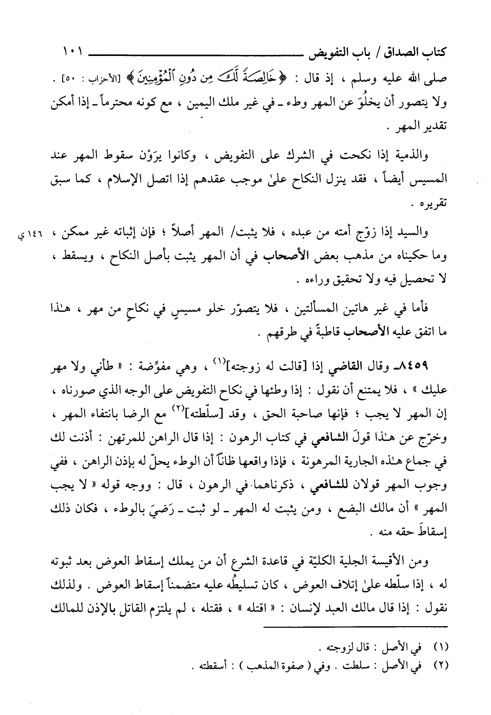 والذمية إذا نكحت في الشرك على التفويض، وكانوا يرَوْن سقوط المهر عند المسيس أيضاً، فقد ينزل النكاح على موجب عقدهم إذا اتصل الإسلام، كما سبق تقريره.
