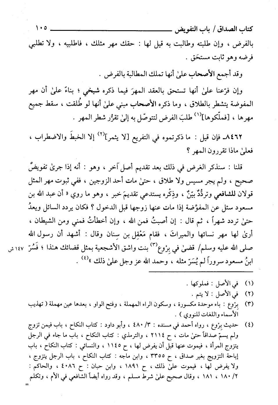 (4) حديث بِرْوع، رواه أحمد في مسنده: 3/ 480، وأبو داود: كتاب النكاح، باب فيمن تزوج ولم يسمّ صداقاً حتى مات، ح 2114، والترمذي: كتاب النكاح، باب ما جاء في الرجل يتزوج المرأة، فيموت عنها قبل أن يفرض لها، ح 1145، والنسائي: كتاب النكاح، باب إباحة التزويج بغير صداق، ح 3355، وابن ماجه: كتاب النكاح، باب الرجل يتزوج، ولا يفرض لها، فيموت على ذلك، ح 1891، وابن حبان: ح 4086، والحاكم: 2/ 180، 181، وقال صحيح على شرط مسلم، وقد رواه أيضاً الشافعي في الأم، وتكلم =