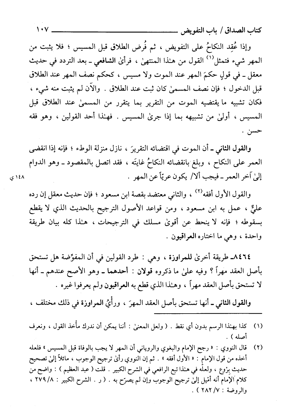 (2) قال النووي: " رجح الإمام والبغوي والروياني أن المهر لا يجب بالوفاة قبل المسيس " فلعله أخذه من قول الإمام: " الأول أفقه ". ثم إن النووي رأى ترجيح الوجوب، مائلاً إلى تصحيح حديث بِرْوع، ولعلّه في هذا تبع الرافعي في الشرح الكبير. قلت (عبد العظيم): واضح من كلام الإمام أنه أمْيل إلى ترجيح الوجوب وإن لم يصرّح به. (ر. الشرح الكبير: 8/ 279، والروضة: 7/ 282).
