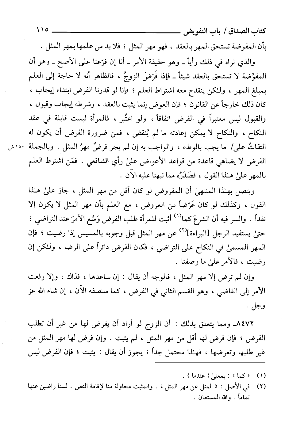 (2) في الأصل: " المثل عن مهر المثل ". والمثبت محاولة منا لإقامة النص. لسنا راضين عنها تماماً. والله المستعان.