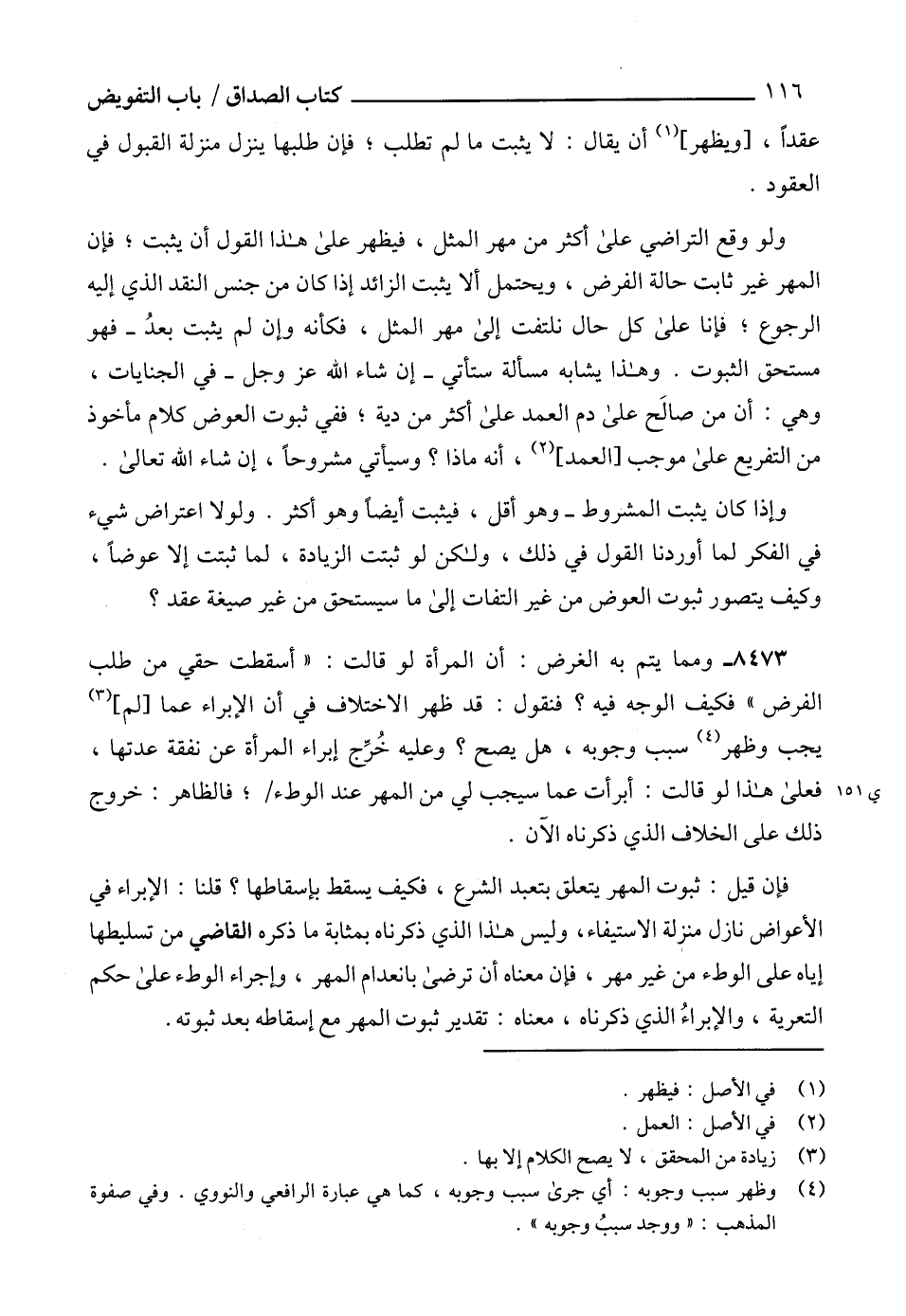 8473 - ومما يتم به الغرض: أن المرأة لو قالت: " أسقطت حقي من طلب الفرض " فكيف الوجه فيه؟ فنقول: قد ظهر الاختلاف في أن الإبراء عما [لم] (3) يجب وظهر (4) سبب وجوبه، هل يصح؟ وعليه خُرِّج إبراء المرأة عن نفقة عدتها، فعلى هذا لو قالت: أبرأت عما سيجب لي من المهر عند الوطء؛ فالظاهر: خروج ذلك على الخلاف الذي ذكرناه الآن.