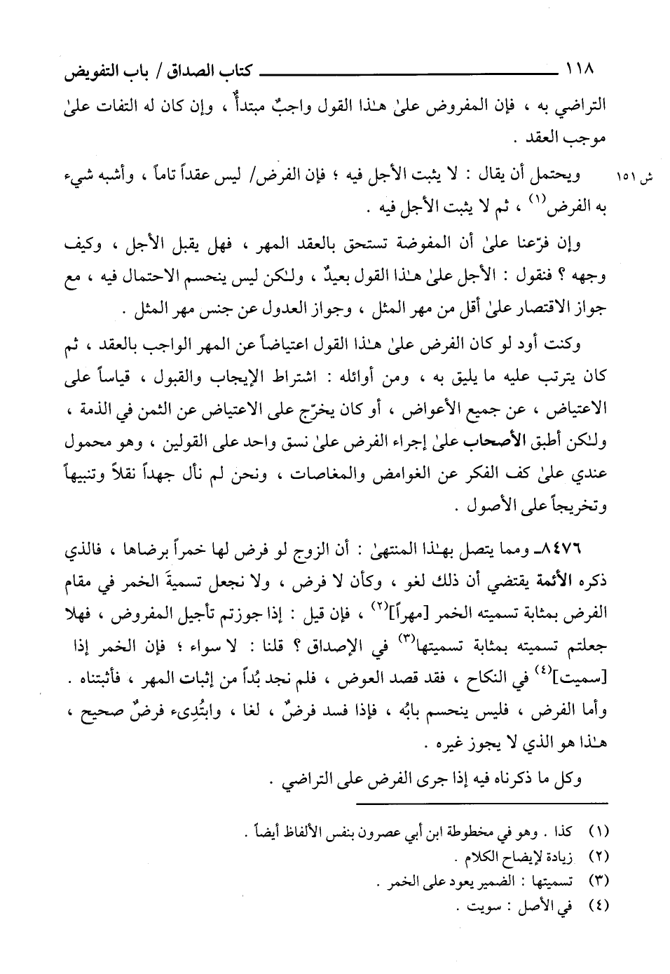 8476 - ومما يتصل بهذا المنتهى: أن الزوج لو فرض لها خمراً برضاها، فالذي ذكره الأئمة يقتضي أن ذلك لغو، وكأن لا فرض، ولا نجعل تسميةَ الخمر في مقام الفرض بمثابة تسميته الخمر [مهراً] (2)، فإن قيل: إذا جوزتم تأجيل المفروض، فهلا جعلتم تسميته بمثابة تسميتها (3) في الإصداق؟ قلنا: لا سواء؛ فإن الخمر إذا [سميت] (4) في النكاح، فقد قصد العوض، فلم نجد بُداً من إثبات المهر، فأثبتناه.