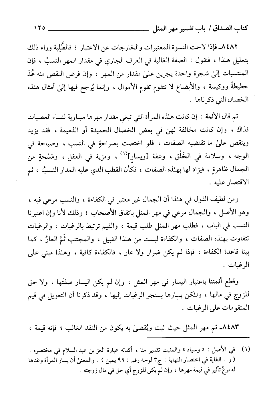 (1) في الأصل: " وسياد " والمثبت تقدير منا، أكدته عبارة العز بن عبد السلام في مختصره. (ر. الغاية في اختصار النهاية: ج 3 لوحة رقم: 99 يمين). والمعنى أن يسار المرأة وغناها له نوعُ تأثير في قيمة مهرها، وإن لم يكن للزوج أي حق في مال زوجته.
