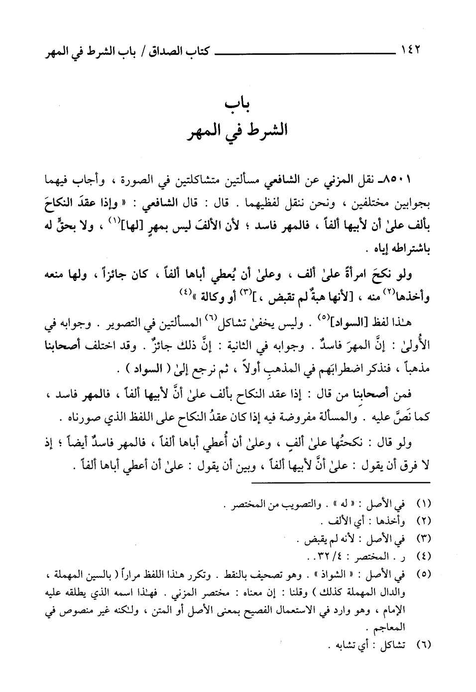 هذا لفظ [السواد] (5). وليس يخفى تشاكل (6) المسألتين في التصوير. وجوابه في الأُولى: إنَّ المهرَ فاسدٌ. وجوابه في الثانية: إنَّ ذلك جائزٌ. وقد اختلف أصحابنا مذهباً، فنذكر اضطرابَهم في المذهبِ أولاً، ثم نرجع إلى (السواد).