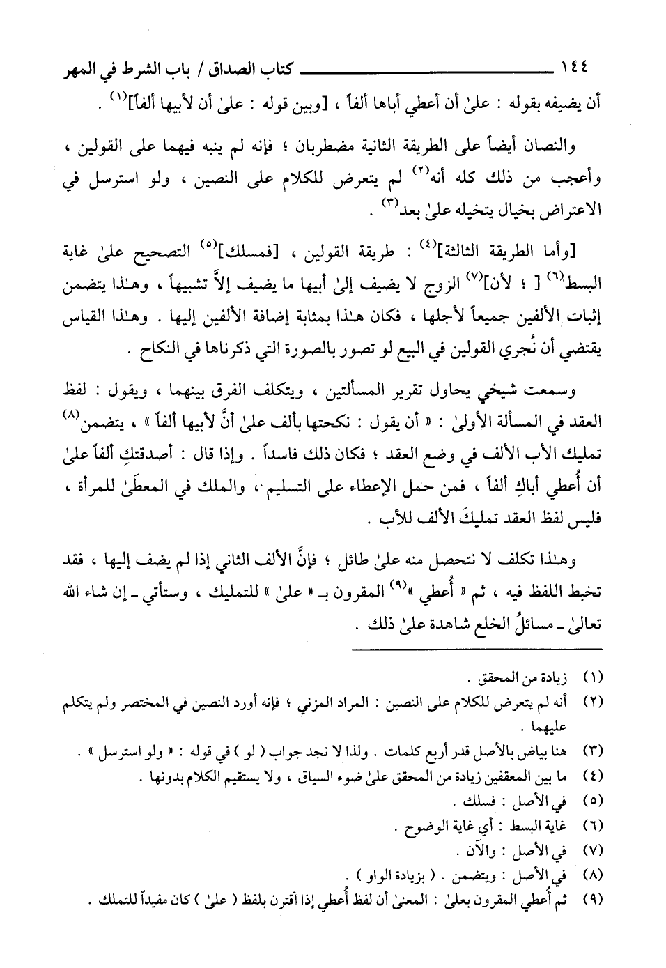وسمعت شيخي يحاول تقرير المسألتين، ويتكلف الفرق بينهما، ويقول: لفظ العقد في المسألة الأولى: " أن يقول: نكحتها بألف على أنَّ لأبيها ألفاًً "، يتضمن (8) تمليك الأب الألف في وضع العقد؛ فكان ذلك فاسداً. وإذا قال: أصدقتكِ ألفاً على أن أُعطي أباكِ ألفاًً، فمن حمل الإعطاء على التسليمْ، والملك في المعطَى للمرأة، فليس لفظ العقد تمليكَ الألف للأب.