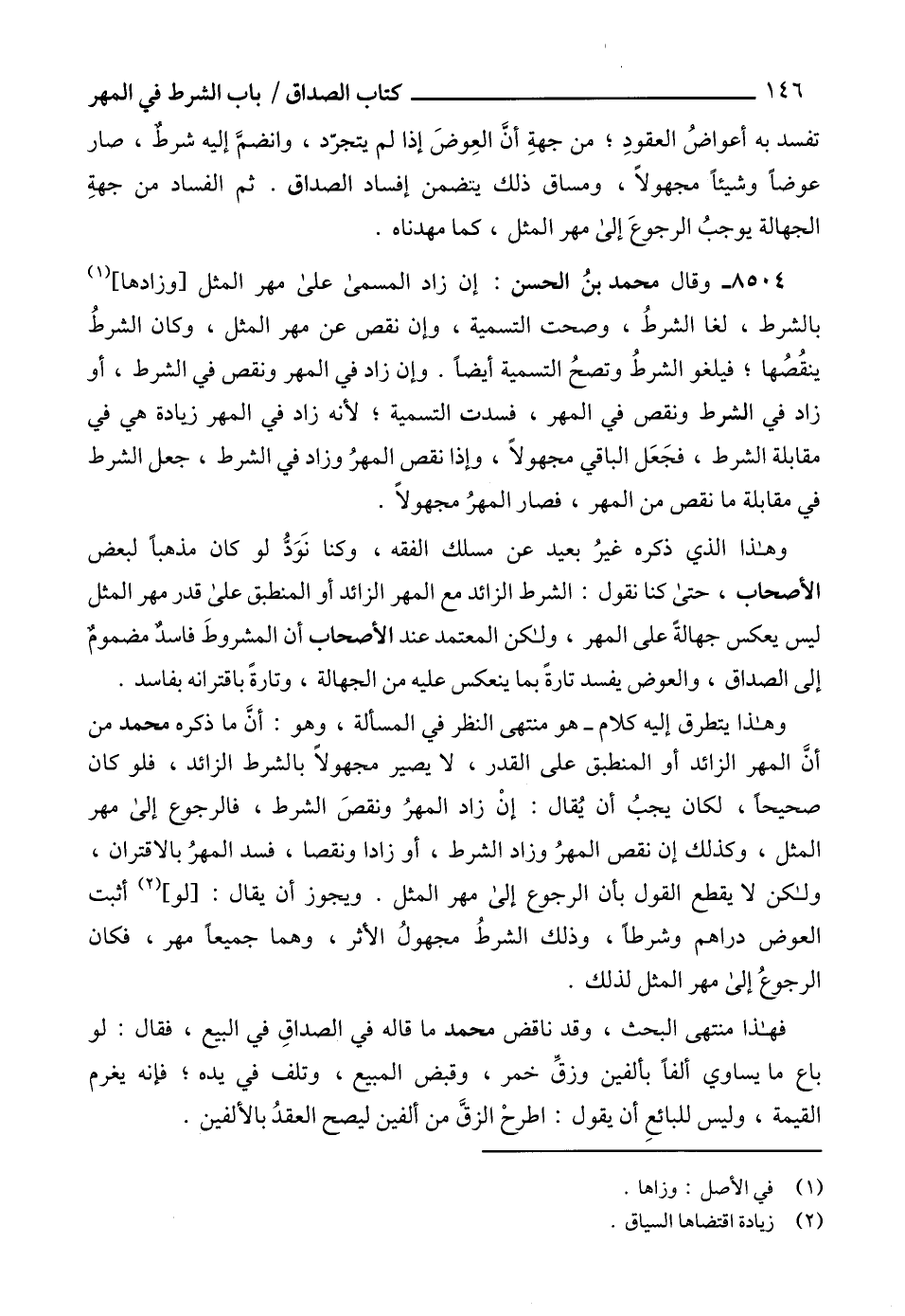8504 - وقال محمد بنُ الحسن: إن زاد المسمى على مهر المثل [وزادها] (1) بالشرط، لغا الشرطُ، وصحت التسمية، وإن نقص عن مهر المثل، وكان الشرطُ ينقُصُها؛ فيلغو الشرطُ وتصحُ التسمية أيضاًً. وإن زاد في المهر ونقص في الشرط، أو زاد في الشرط ونقص في المهر، فسدت التسمية؛ لأنه زاد في المهر زيادة هي في مقابلة الشرط، فجَعَل الباقي مجهولاً، وإذا نقص المهرُ وزاد في الشرط، جعل الشرط في مقابلة ما نقص من المهر، فصار المهرُ مجهولاً.