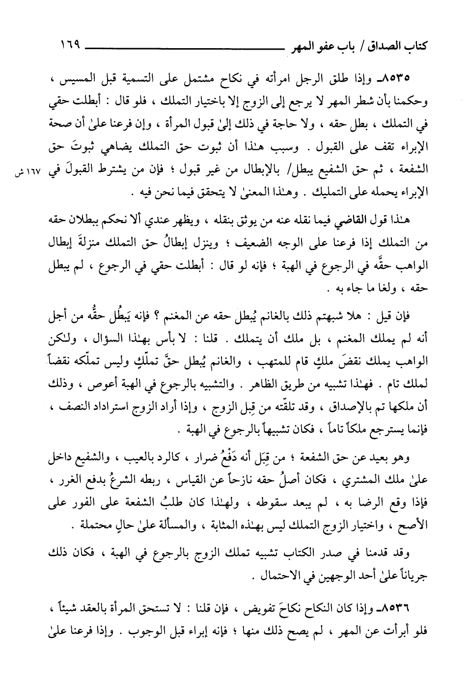 8535 - وإذا طلق الرجل امرأته في نكاح مشتمل على التسمية قبل المسيس، وحكمنا بأن شطر المهر لا يرجع إلى الزوج إلا باختيار التملك، فلو قال: أبطلت حقي في التملك، بطل حقه، ولا حاجة في ذلك إلى قبول المرأة، وإن فرعنا على أن صحة الإبراء تقف على القبول. وسبب هذا أن ثبوت حق التملك يضاهي ثبوتَ حق الشفعة، ثم حق الشفيع يبطل بالإبطال من غير قبول؛ فإن من يشترط القبولَ في الإبراء يحمله على التمليك. وهذا المعنى لا يتحقق فيما نحن فيه.