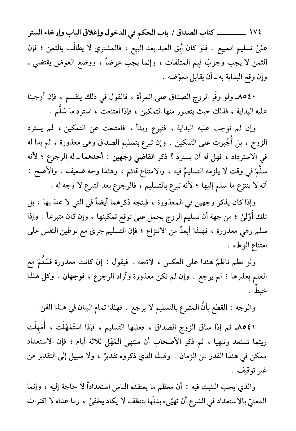 8541 - ثم إذا ساق الزوج الصداق، فعليها التسليم، فإذا استَمْهَلَت، أُمْهِلَت ريثما تستعد وتتهيأ، ثم ذكر الأصحاب أن منتهى المَهَل ثلاثة أيام؛ فإن الاستعداد ممكن في هذا القدر من الزمان. وهذا الذي ذكروه تقديرٌ، ولا سبيل إلى التقدير من غير توقيف.