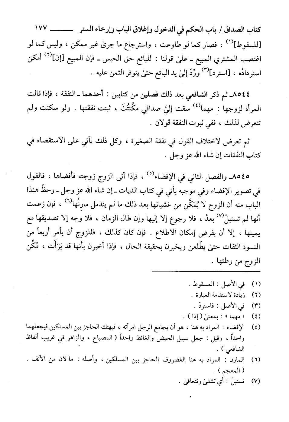 (5) الإفضاء: المراد به هنا، هو أن يجامع الرجل امرأته، فيهتك الحاجز بين المسلكين فيجعلهما واحداً، وقيل: جعل سبيل الحيض والغائط واحداً (المصباح، والزاهر في غريب ألفاظ الشافعي).