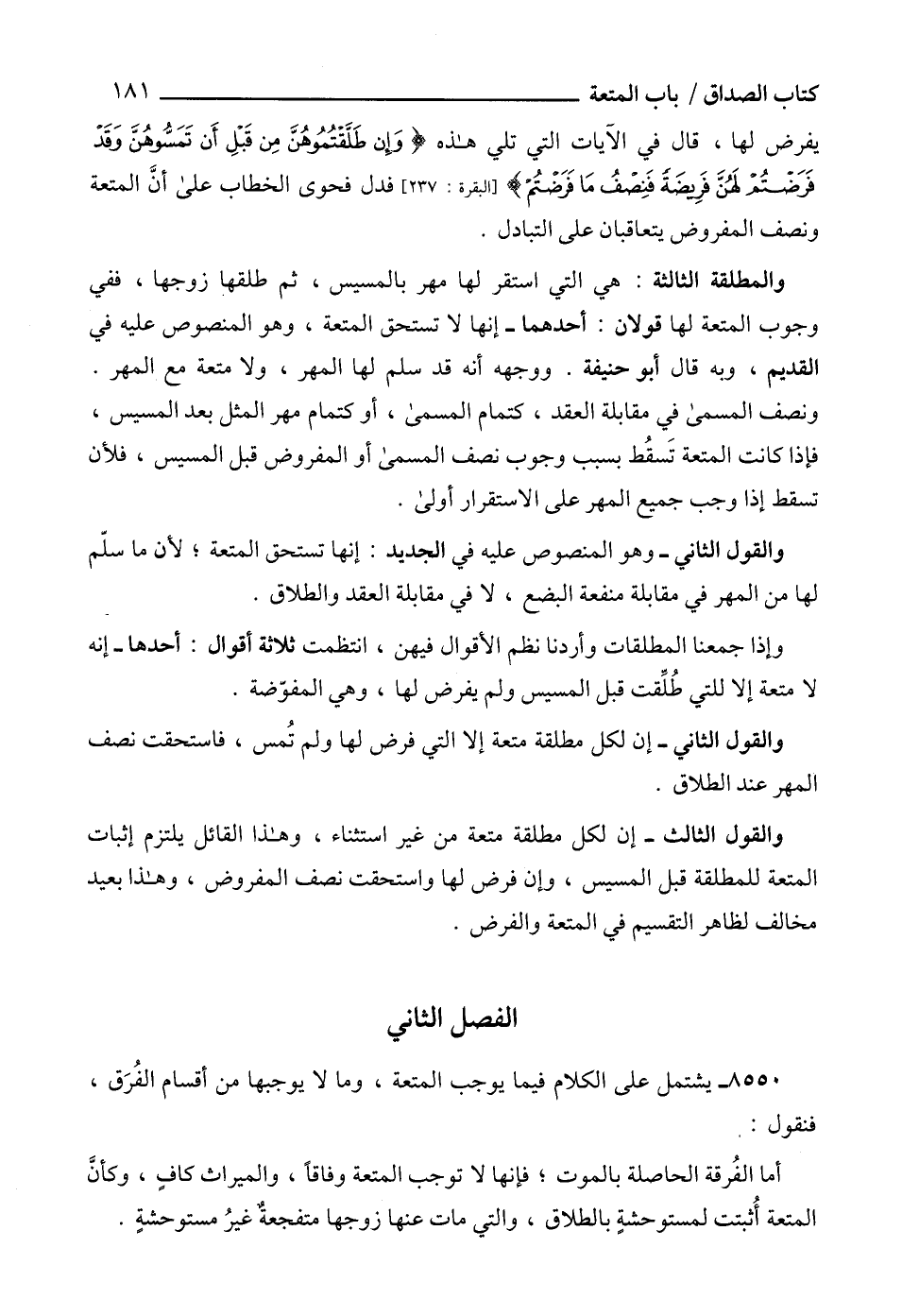 8550 - يشتمل على الكلام فيما يوجب المتعة، وما لا يوجبها من أقسام الفُرَق، فنقول: أما الفُرقة الحاصلة بالموت؛ فإنها لا توجب المتعة وفاقاً، والميراث كافٍ، وكأنَّ المتعة أُثبتت لمستوحشةٍ بالطلاق، والتي مات عنها زوجها متفجعةٌ غيرُ مستوحشةٍ.