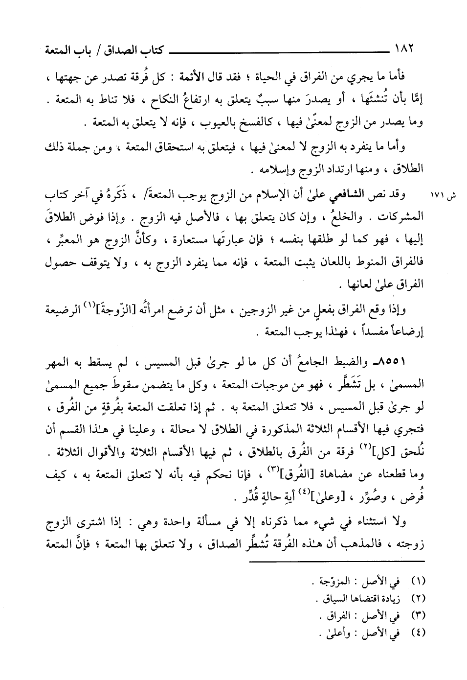 8551 - والضبط الجامعُ أن كل ما لو جرى قبل المسيس، لم يسقط به المهر المسمى، بل تَشَطَّر، فهو من موجبات المتعة، وكل ما يتضمن سقوطَ جميع المسمى لو جرى قبل المسيس، فلا تتعلق المتعة به. ثم إذا تعلقت المتعة بفُرقةٍ من الفُرق، فتجري فيها الأقسام الثلاثة المذكورة في الطلاق لا محالة، وعلينا في هذا القسم أن نُلحق [كل] (2) فرقة من الفُرق بالطلاق، ثم فيها الأقسام الثلاثة والأقوال الثلاثة.