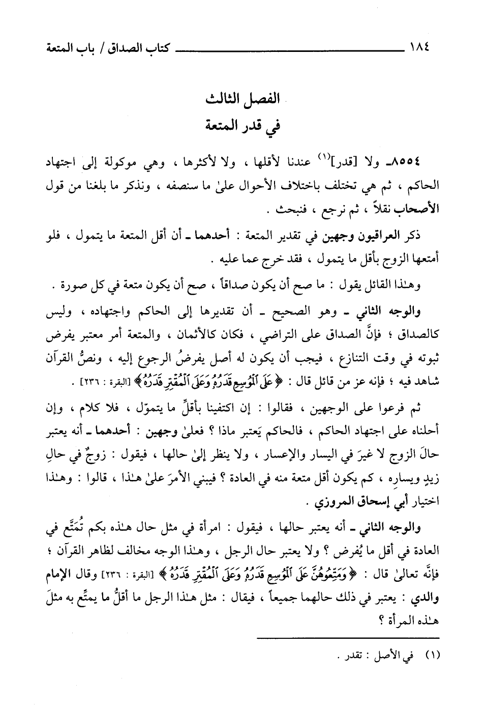 والوجه الثاني - أنه يعتبر حالها، فيقول: امرأة في مثل حال هذه بكم تُمَتَّع في العادة في أقل ما يُفرض؟ ولا يعتبر حال الرجل، وهذا الوجه مخالف لظاهر القرآن، فإنَّه تعالى قال: {وَمَتِّعُوهُنَّ عَلَى الْمُوسِعِ قَدَرُهُ وَعَلَى الْمُقْتِرِ قَدَرُهُ} [البقرة: 236] وقال الإمام والدي: يعتبر في ذلك حالهما جميعاً، فيقال: مثل هذا الرجل ما أقلُّ ما يمتِّع به مثلَ هذه المرأة؟