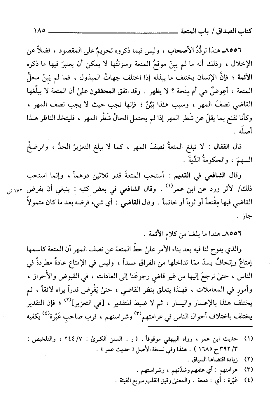 8556 - هذا تردُّدُ الأصحاب، وليس فيما ذكروه تحويمٌ على المقصود، فضلاً عن الإخلال، وذلك أنه ما لم يبِنْ موقعُ المتعة ومنزلتُها لا يمكن أن يعتبرَ فيها ما ذكره الأئمة؛ فإنَّ الإنسان يختلف ما يبذله إذا اختلف جهاتُ المبذول، فما لم يَبِنْ محلُّ المتعة، أعِوضٌ هي أم مِنْحة؟ لا يظهر. وقد اتفق المحققون على أن المتعة لا يبلِّغها القاضي نصفَ المهر، وسبب هذا بينٌ؛ فإنها تجب حيث لا يجب نصف المهر، وكأنا نقنع بما يقلّ عن شَطر المهر إذا لم يحتمل الحالُ شَطْر المهر، فليتخذ الناظر هذا أصلَه.