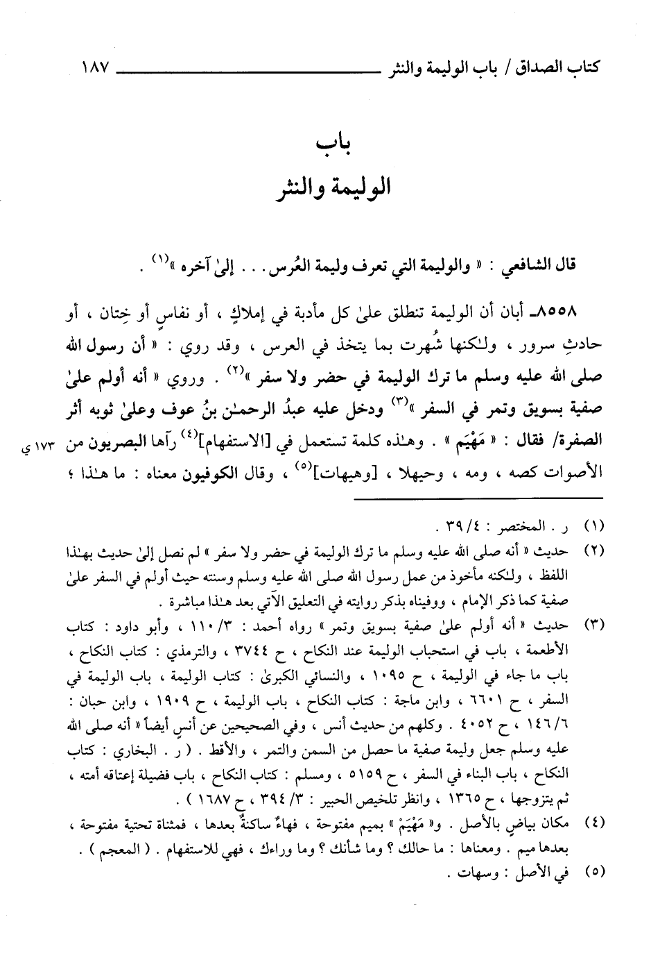 (2) حديث "أنه صلى الله عليه وسلم ما ترك الوليمة في حضر ولا سفر" لم نصل إلى حديث بهذا اللفظ، ولكنه مأخوذ من عمل رسول الله صلى الله عليه وسلم وسنته حيث أولم في السفر على صفية كما ذكر الإمام، ووفيناه بذكر روايته في التعليق الآتي بعد هذا مباشرة.