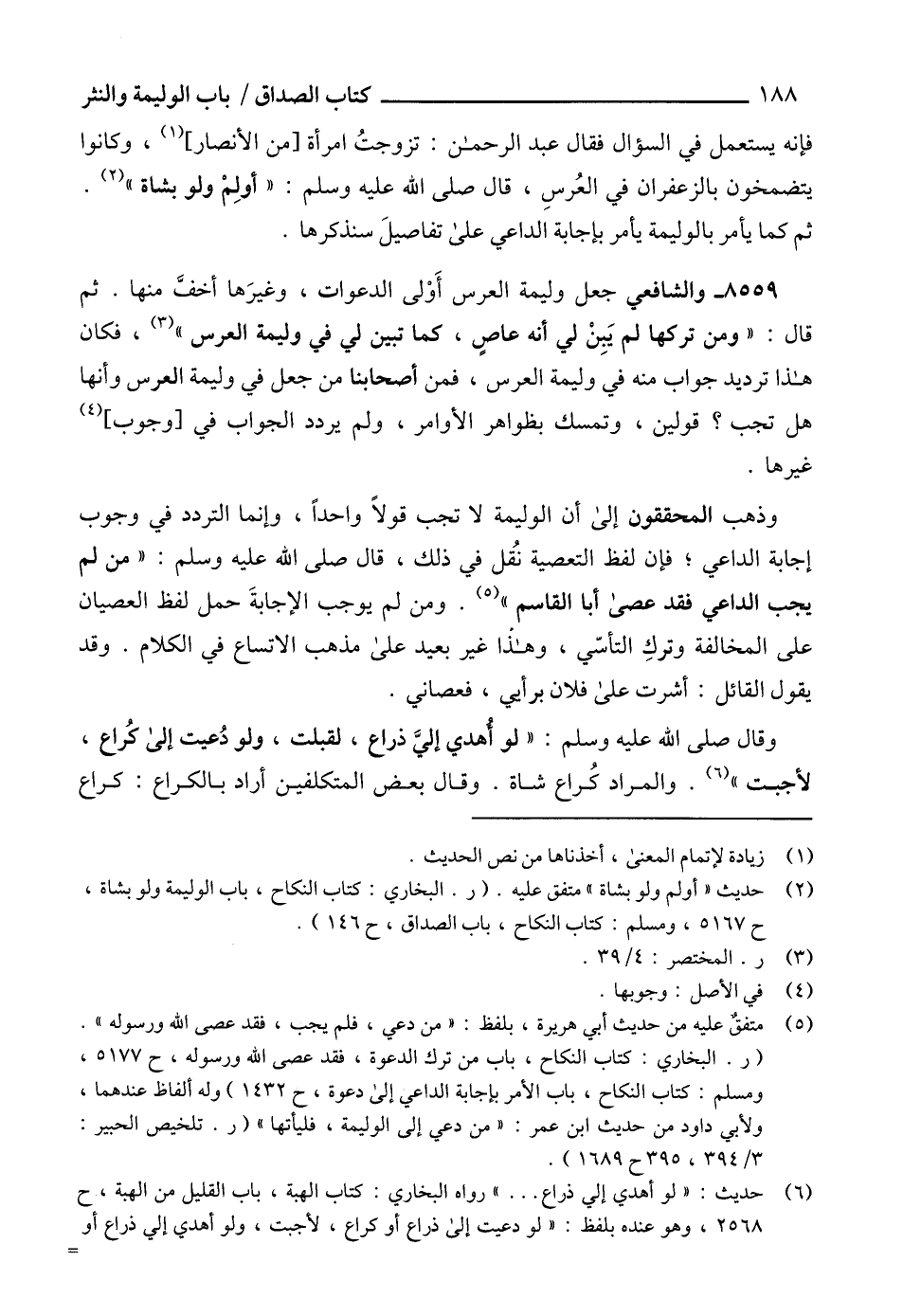 (2) حديث " أولم ولو بشاة " متفق عليه. (ر. البخاري: كتاب النكاح، باب الوليمة ولو بشاة، ح 5167، ومسلم: كتاب النكاح، باب الصداق، ح 146).