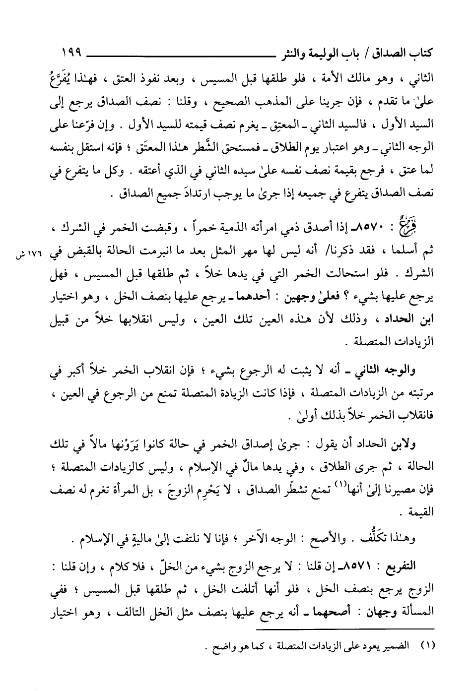 ولابن الحداد أن يقول: جرى إصداق الخمر في حالة كانوا يَرَوْنها مالاً في تلك الحالة، ثم جرى الطلاق، وفي يدها مال في الإسلام، وليس كالزيادات المتصلة؛ فإن مصيرنا إلى أنها (1) تمنع تشطّر الصداق، لا يَحْرِم الزوجَ، بل المرأة تغرم له نصف القيمة.