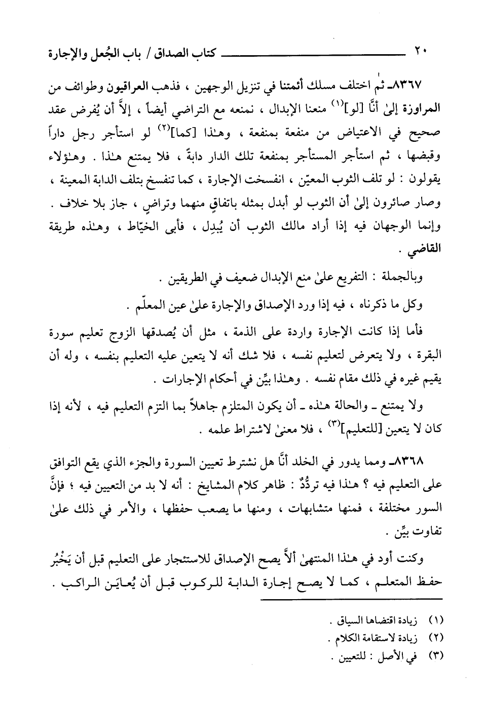 وكنت أود في هذا المنتهى ألاَّ يصح الإصداق للاستئجار على التعليم قبل أن يَخْبُر حفظ المتعلم، كما لا يصح إجارة الدابة للركوب قبل أن يُعايَن الراكب.