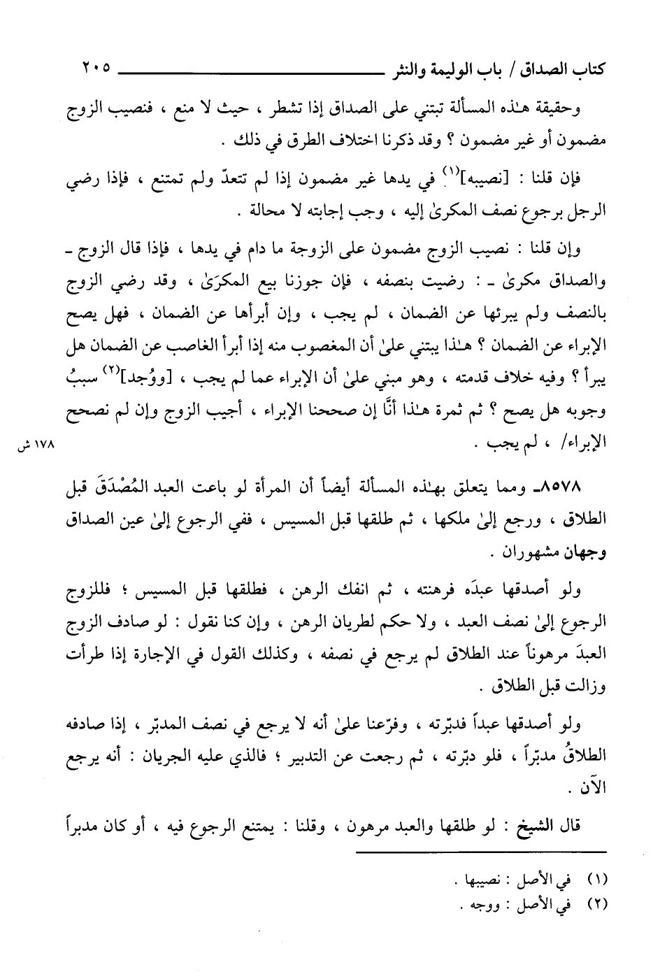 8578 - ومما يتعلق بهذه المسألة أيضاًً أن المرأة لو باعت العبد المُصْدَقَ قبل الطلاق، ورجع إلى ملكها، ثم طلقها قبل المسيس، ففي الرجوع إلى عين الصداق وجهان مشهوران.