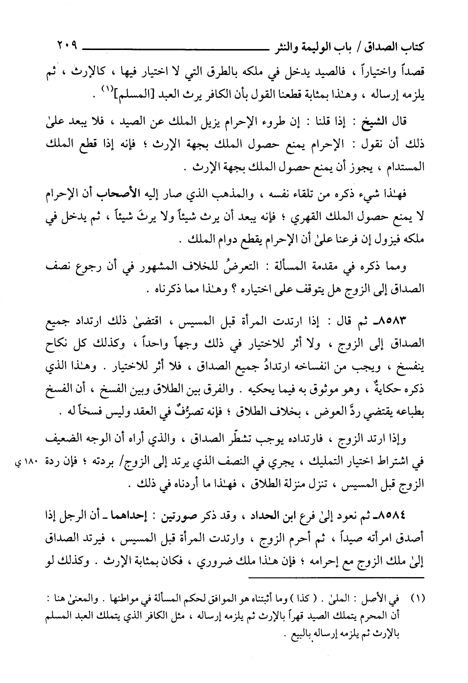 8584 - ثم نعود إلى فرع ابن الحداد، وقد ذكر صورتين: إحداهما - أن الرجل إذا أصدق امرأته صيداً، ثم أحرم الزوج، وارتدت المرأة قبل المسيس، فيرتد الصداق إلى ملك الزوج مع إحرامه؛ فإن هذا ملك ضروري، فكان بمثابة الإرث. وكذلك لو