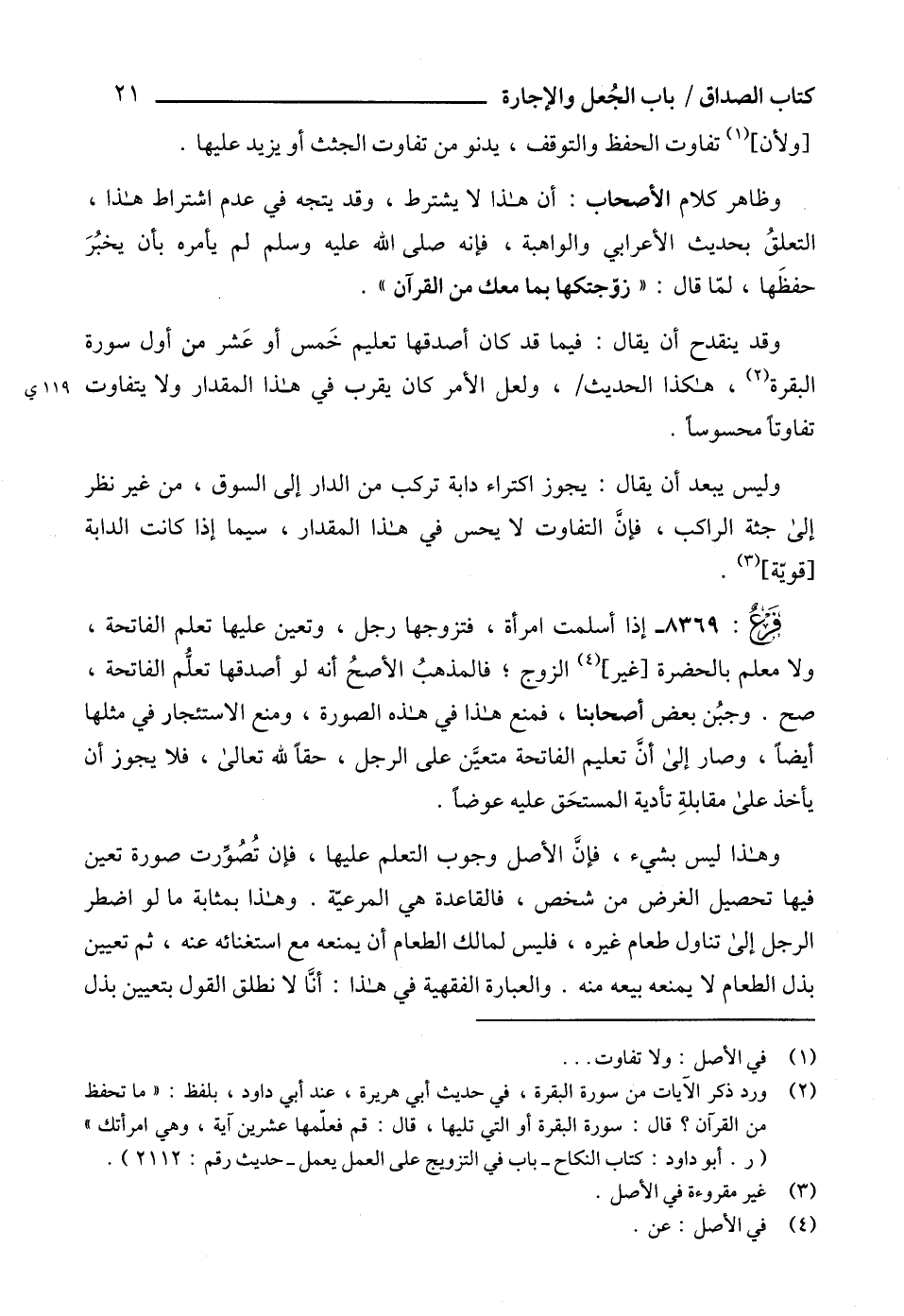 (2) ورد ذكر الآيات من سورة البقرة، في حديث أبي هريرة، عند أبي داود، بلفظ: " ما تحفظ من القرآن؟ قال: سورة البقرة أو التي تليها، قال: قم فعلّمها عشرين آية، وهي امرأتك " (ر. أبو داود: كتاب النكاح -باب في التزويج على العمل يعمل- حديث رقم: 2112).