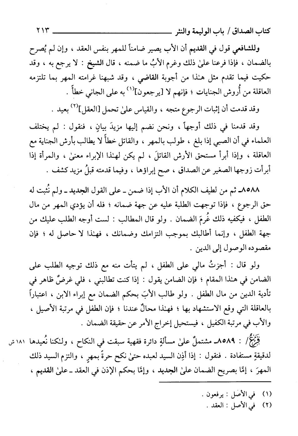 8589 - مشتملٌ على مسألةٍ دائرة فقهية سبقت في النكاح، ولكنا نُعيدها لدقيقةٍ مستفادة. فنقول: إذا أذِن السيد لعبده حتى نكح حرةً بمهرٍ، والتزم السيد ذلك المهرَ، إمَّا بصريح الضمان على الجديد، وإمَّا بحكم الإذن في العقد- على القديم،