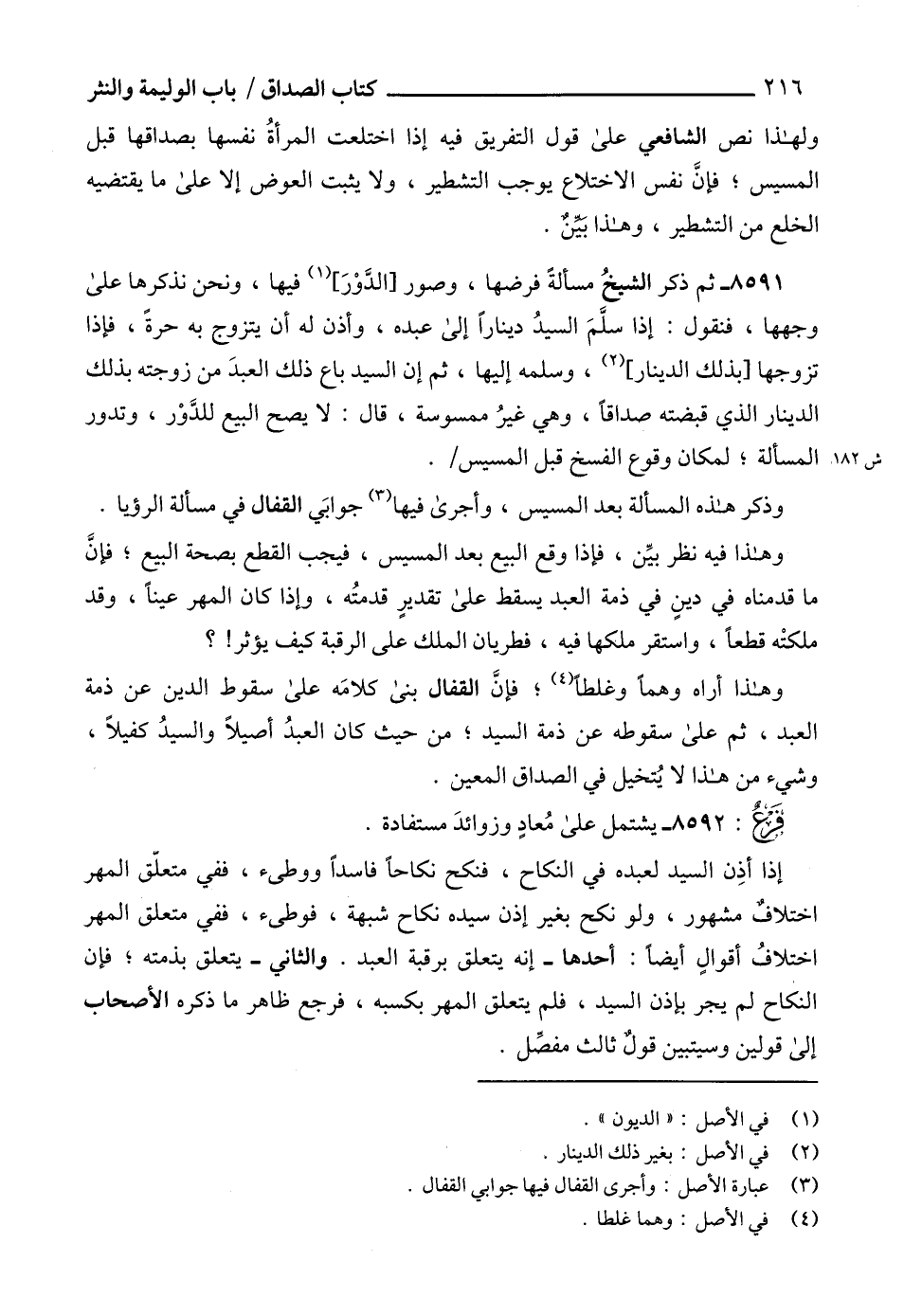 8591 - ثم ذكر الشيخُ مسألةً فرضها، وصور [الدَّوْرَ] (1) فيها، ونحن نذكرها على وجهها، فنقول: إذا سلَّمَ السيدُ ديناراً إلى عبده، وأذن له أن يتزوج به حرةً، فإذا تزوجها [بذلك الدينار] (2)، وسلمه إليها، ثم إن السيد باع ذلك العبدَ من زوجته بذلك الدينار الذي قبضته صداقاً، وهي غيرُ ممسوسة، قال: لا يصح البيع للدَّوْر، وتدور المسألة، لمكان وقوع الفسخ قبل المسيس.