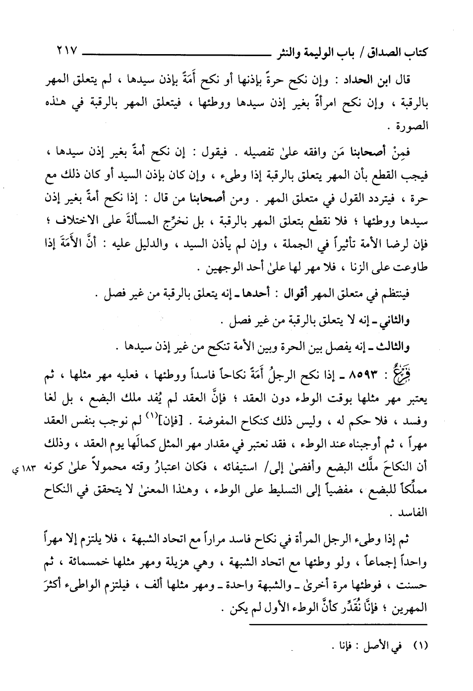 قال ابن الحداد: وإن نكح حرةً بإذنها أو نكح أَمَةً بإذن سيدها، لم يتعلق المهر بالرقبة، وإن نكح امرأةً بغير إذن سيدها ووطئها، فيتعلق المهر بالرقبة في هذه الصورة.