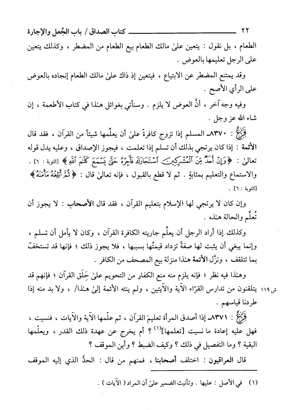 8370 - المسلم إذا تزوج كافرةً على أن يعلِّمها شيئاً من القرآن، فقد قال الأئمة: إذا كان يرتجي بذلك أن تسلم إذا تعلمت، فيجوز الإصداق، وعليه يدل قوله تعالى: {وَإِنْ أَحَدٌ مِنَ الْمُشْرِكِينَ اسْتَجَارَكَ فَأَجِرْهُ حَتَّى يَسْمَعَ كَلَامَ اللَّهِ} [التوبة: 6] والاستماع والتعليم بمثابةٍ. ثم لا قطع بالقبول، فإنه تعالى قال: {ثُمَّ أَبْلِغْهُ مَأْمَنَهُ} [التوبة: 6]