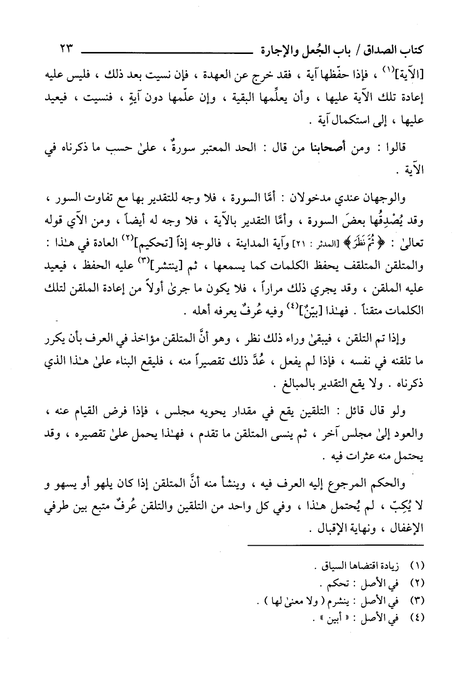 والوجهان عندي مدخولان: أمَّا السورة، فلا وجه للتقدير بها مع تفاوت السور، وقد يُصْدِقُها بعضَ السورة، وأمَّا التقدير بالآية، فلا وجه له أيضاً، ومن الآي قوله تعالى: {ثُمَّ نَظَرَ} [المدثر: 21] وآية المداينة، فالوجه إذاً [تحكيم] (2) العادة في هذا: والمتلقن المتلقف يحفظ الكلمات كما يسمعها، ثم [ينتشر] (3) عليه الحفظ، فيعيد عليه الملقن، وقد يجري ذلك مراراً، فلا يكون ما جرى أولاً من إعادة الملقن لتلك الكلمات متقناً. فهذا [بيّنٌ] (4) وفيه عُرفٌ يعرفه أهله.