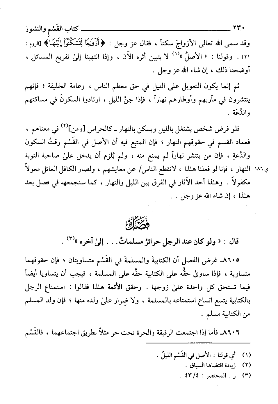 وقد سمى الله تعالى الأزواجَ سكناً، فقال عز وجل: {أَزْوَاجًا لِتَسْكُنُوا إِلَيْهَا} [الروم: 21]. وقولنا: "الأصلُ " (1) لا يتبين أثره الآن، وإذا انتهينا إلى تفريع المسائل، أوضحنا ذلك، إن شاء الله عز وجل.