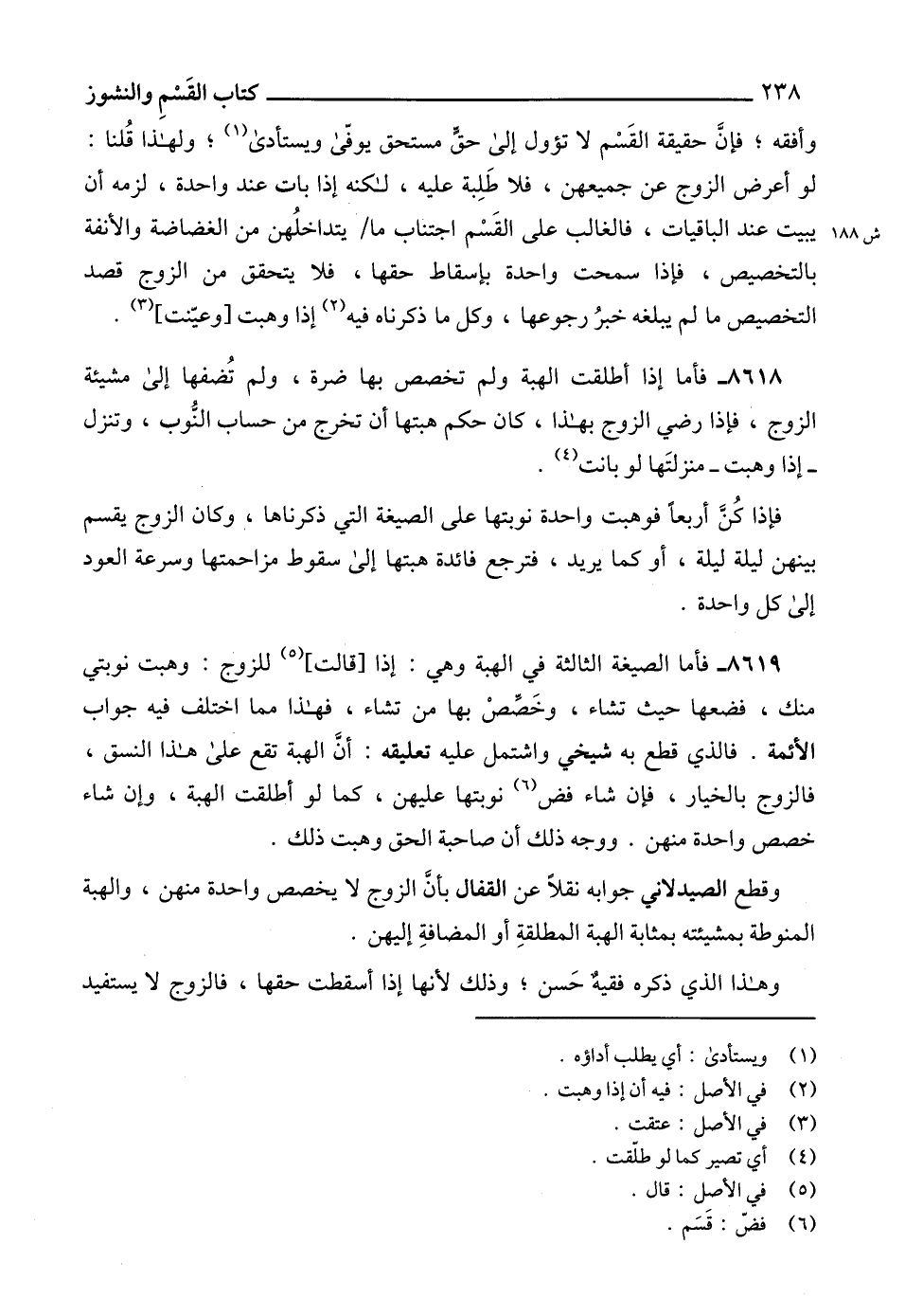 وأفقه؛ فإنَّ حقيقة القَسْم لا تؤول إلى حقٍّ مستحق يوفّى ويستأدى (1)؛ ولهذا قُلنا: لو أعرض الزوج عن جميعهن، فلا طَلِبة عليه، لكنه إذا بات عند واحدة، لزمه أن يبيت عند الباقيات، فالغالب على القَسْم اجتناب ما يتداخلُهن من الغضاضة والأنفة بالتخصيص، فإذا سمحت واحدة بإسقاط حقها، فلا يتحقق من الزوج قصد التخصيص ما لم يبلغه خبرُ رجوعها، وكل ما ذكرناه فيه (2) إذا وهبت [وعيّنت] (3).