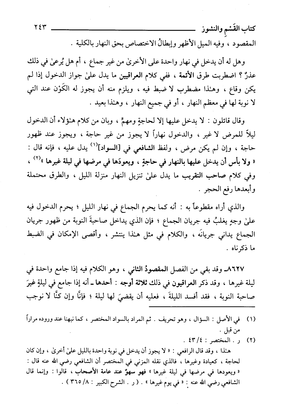هذا، وقد قال الرافعي: "لا يجوز أن يدخل في نوبة واحدة بالليل على أخرى، وإن كان لحاجة، كعيادة وغيرها، فالذي نقله المزني في المختصر أن الشافعي رضي الله عنه قال: " ويعودها في مرضها في ليلة غيرها " فهو سهوٌ عند عامة الأصحاب، قالوا: وإنما قال الشافعي رضي الله عنه: " في يوم غيرها ". (ر. الشرح الكبير: 8/ 365).