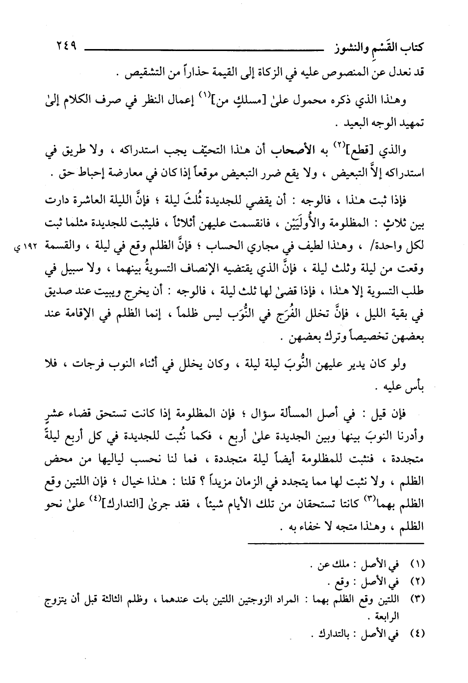 فإن قيل: في أصل المسألة سؤال؛ فإن المظلومة إذا كانت تستحق قضاء عشرٍ وأدرنا النوبَ بينها وبين الجديدة على أربع، فكما نُثبت للجديدة في كل أربع ليلةً متجددة، فنثبت للمظلومة أيضاًًً ليلة متجددة، فما لنا نحسب لياليها من محض الظلم، ولا نثبت لها مما يتجدد في الزمان مزيداً؟ قلنا: هذا خيال؛ فإن اللتين وقع الظلم بهما (3) كانتا تستحقان من تلك الأيام شيئاً، فقد جرى [التدارك] (4) على نحو الظلم، وهذا متجه لا خفاء به.