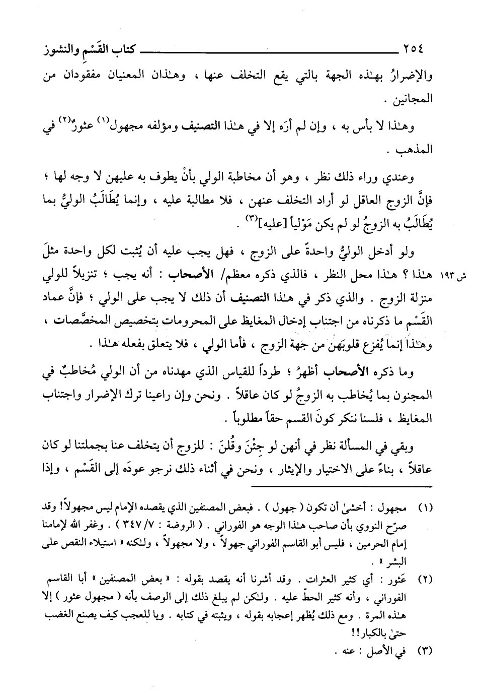 (1) مجهول: أخشى أن تكون (جهول). فبعض المصنفين الذي يقصده الإمام ليس مجهولاً! وقد صرّح النووي بأن صاحب هذا الوجه هو الفوراني. (الروضة: 7/ 347). وغفر الله لإمامنا إمام الحرمين، فليس أبو القاسم الفوراني جهولاً، ولا مجهولاً، ولكنه "استيلاء النقص على البشر".