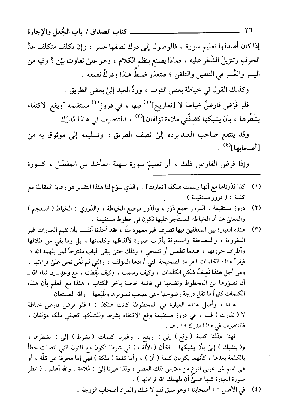 هذا، وأصل هذه العبارة في المخطوطة كانت هكذا: " فلو فرض فارض خياطة لا (نفارت) فيها، في دروز مستقيمة وقع الاكتفاء بشرطا وللشكها كضفي ملكه مؤلفان، فالتنصيف في هذا مدرك " ا. هـ.